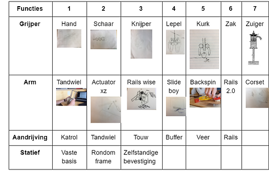 Gekozen combinatie grijper+arm per groepslid: